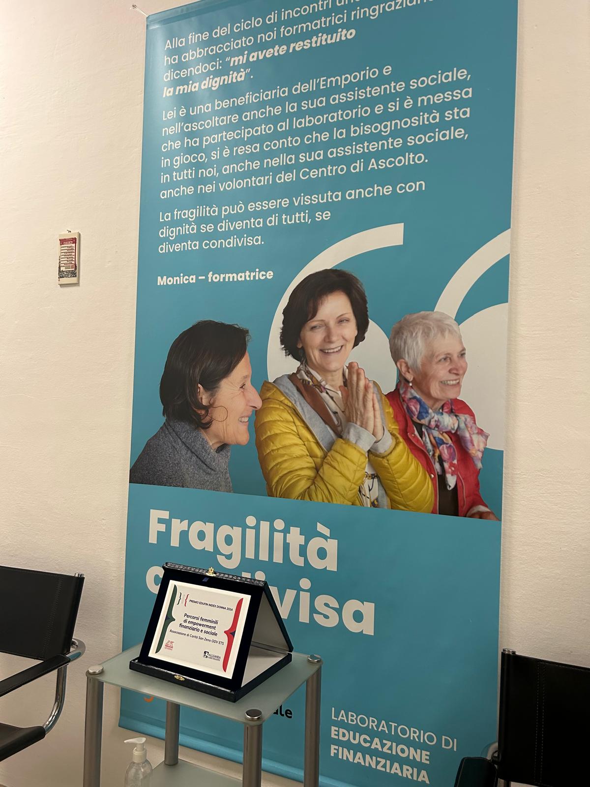 A elevare il nostro tasso di felicità è un’altra bellissima notizia: le Officine culturali di Caritas Verona ha ricevuto il Premio Edufin Index Donna 2024 per le best practices nell’ambito dell’educazione finanziaria. Un riconoscimento di prestigio attribuito a soli 3 progetti degli oltre 100 partecipanti alla selezione e ritirato al Senato della Repubblica da due rappresentanti della realtà veneta, Maria Luciana e Clotilde.